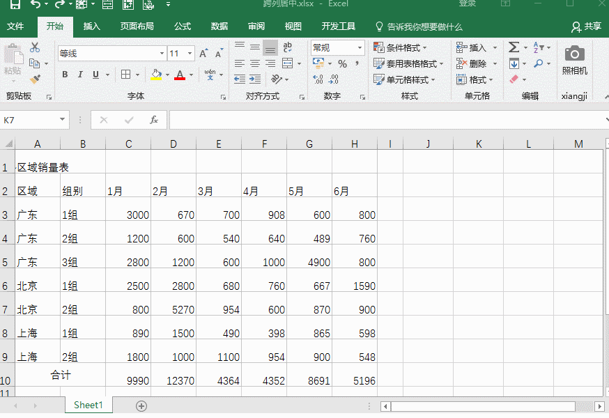 看到了吗?当我们对标题进行“跨列居中”的文本对齐方式处理后,表面上看是合并所有的单元格了,实际上每个单元格还是独立存在的,不会影响表格的其它操作。