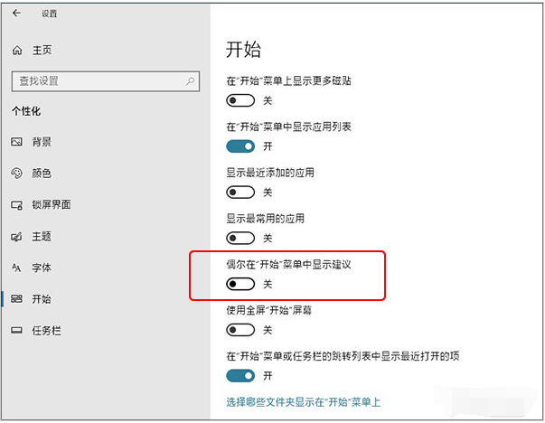 取消“偶尔在‘开始’菜单中显示建议”