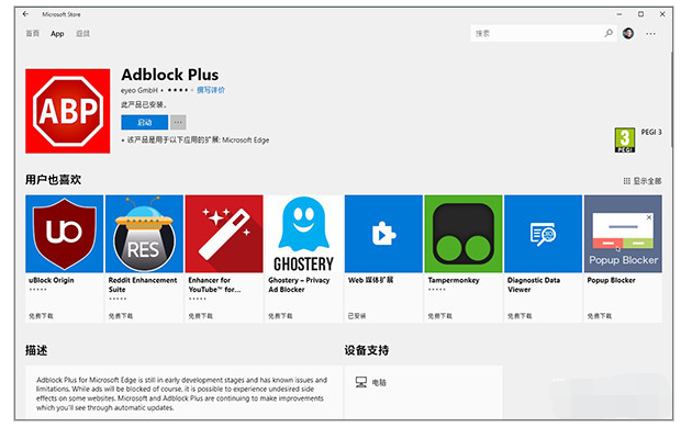 相比IE11,Edge的最大亮点就是支持扩展,因此我们可以下载很多更专业的扩展,来去除网页中的广告。