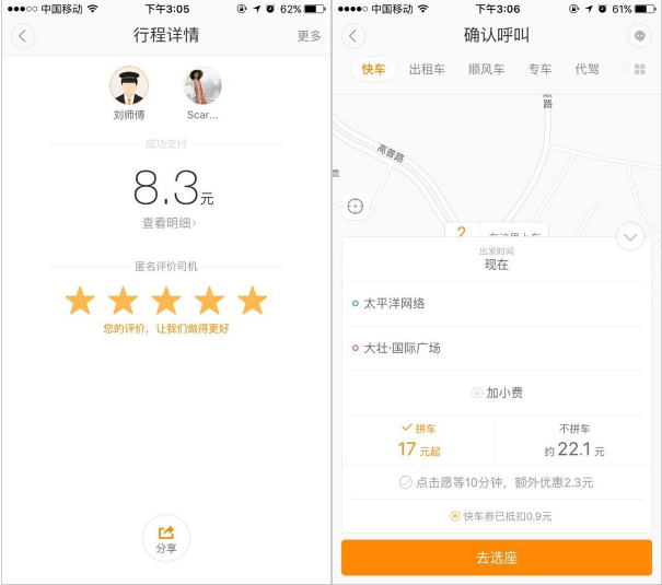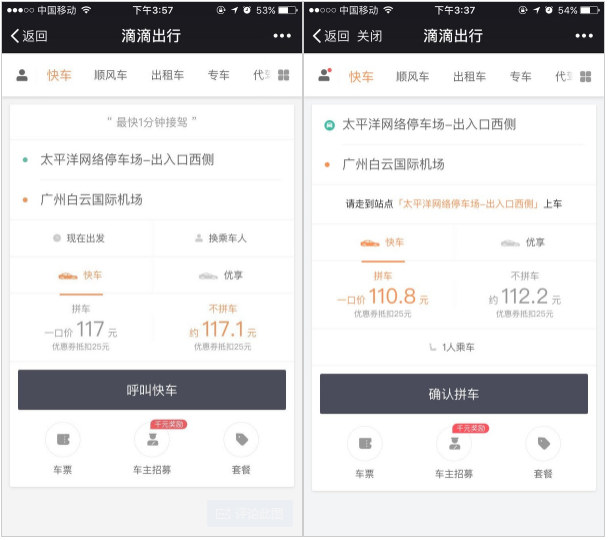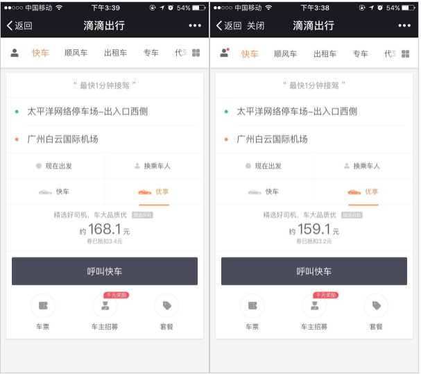 另一个价格差别更明显的是滴滴,这已经不是第一次有朋友向笔者吐槽打滴滴越来越贵了。在滴滴和优步合并之后,滴滴的价格飞快上涨,就拿和笔者在用一个办公室上班的同事来说,以前用坐公交车的钱就能拼个车来上班,后来滴滴价格飞速上涨,但是由于没有其他的交通方式,她也就一直默默忍受了。