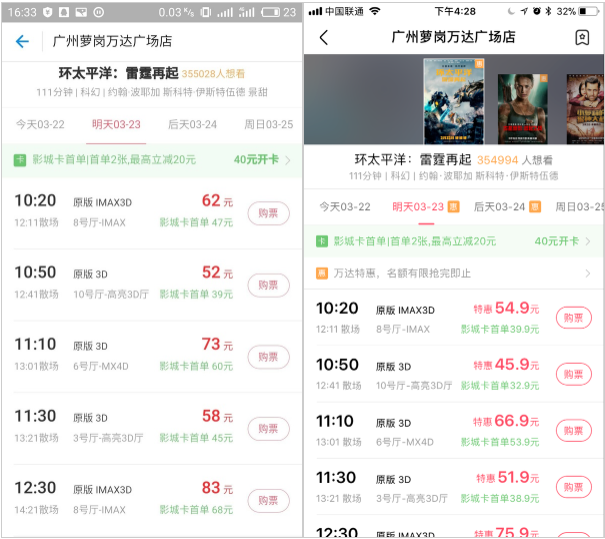 编辑部的吴老师经常去某家影院看电影,由于是忠诚的老用户,因此在买电影票上,他的票价要比一般用户更贵。从下面的两张截图可以看出明显的价格差别:老用户不享受任何优惠,app打开频率较低的用户,却得到了特享的优惠。