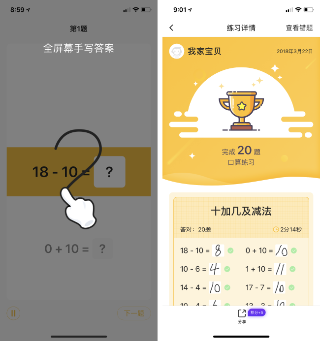 小猿口算利用强化的 OCR 技术,通过拍照识别可以瞬间完成批改,还能定位错题进行针对性订正,至少比家长检查快了 10 分钟。准确度更重要,如果因为家长漏检导致得分不理想,老师会说家长不负责,学生会产生信心和兴趣减弱。所以这个切入点还是很关键的。