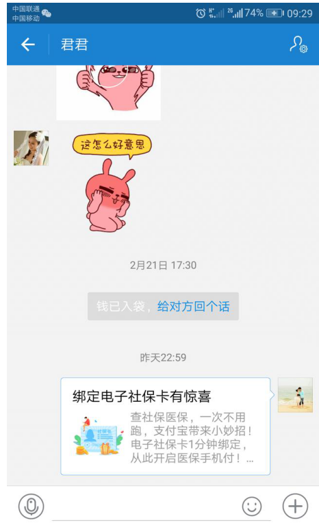 6、小编是推荐给支付宝好友,对方只要点开我的链接,选择绑定自己的社保卡,双方都将得到支付宝发给的赏金。