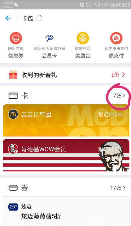 2、打开之后,进入卡包页面,找到卡选项,点开它。