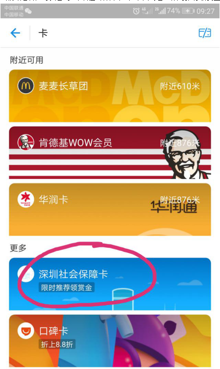 3、点开之后,可以看到<深圳社会保障卡>,下面写着“限时推荐领赏金”,我们再点开。