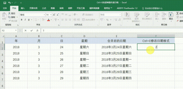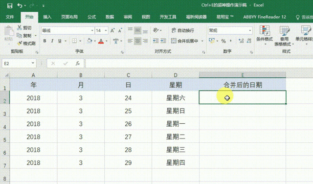 比如有些工作表年月日和星期几都是分开显示的,S姐要合并在一起,也是先把第一行写入,然后 Ctrl+E 就可以全部填充。