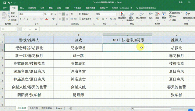 比如我们要把A列的游戏和推荐人分成两列,只需要先插入两列,在B列游戏和C列推荐人里写上对应的信息,然后直接按Ctrl+E,就可以快速填充。