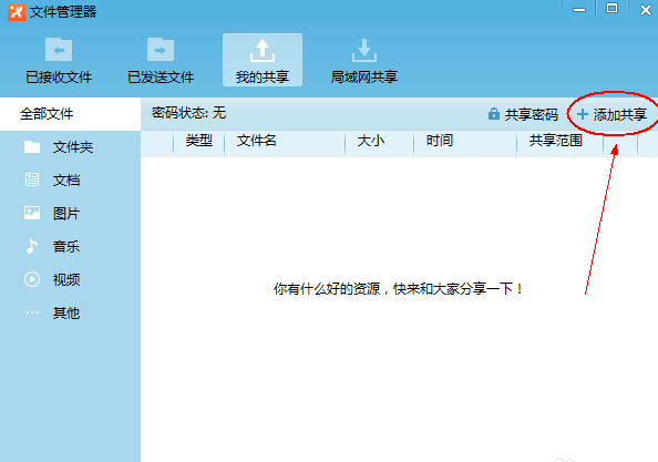 3、弹出文件管理器选项卡,单击“添加共享”,