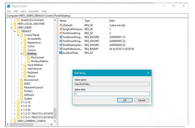 2、创建一个字符串值并将其命名为AutoEndTasks。 现在双击此并将值设置为1;