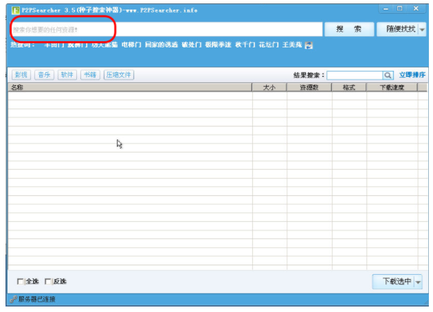 1、打开p2psearcher3.5绿色版,在搜索栏内可搜索你想要的关键词,