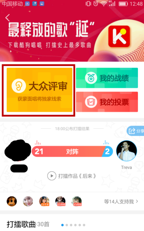 2、找到“大众评审”版块,进入即可当大众评委,并开始投票。PS:哪怕不唱一首歌,只当评委也是有等级的呢。而且,在当评委投票的过程中,系统会随机给你派发各种礼物哦。