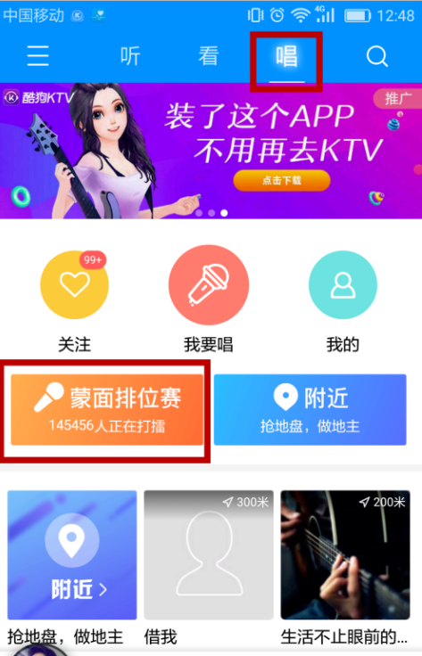 1、打开酷狗音乐app,找到“唱”版块里的“蒙面排位赛”,点击进入。