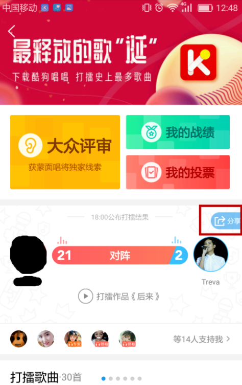 6、在对阵列表右上角有个“分享”按钮,点击即可邀请微信、QQ、微博好友为你投票助阵,但酷狗规定:好友最多可支持3票。