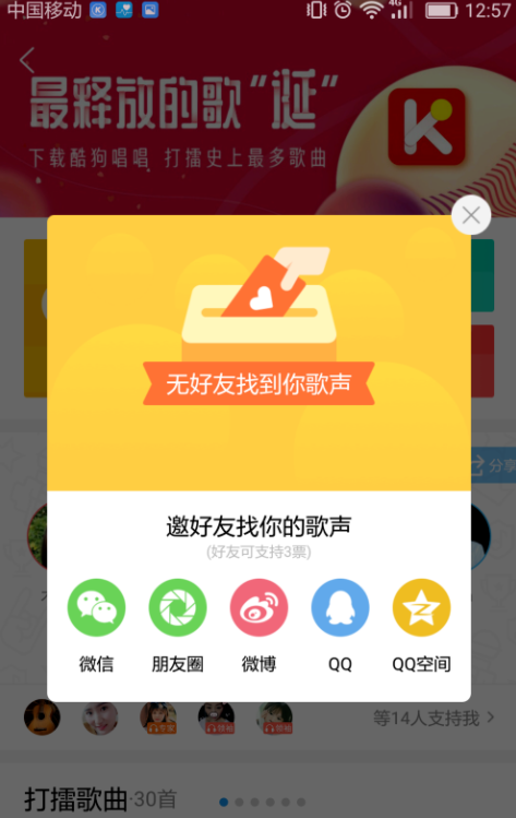 酷狗音乐中新推了“打擂”玩法,很多用户都有参与体验,如果你也想参加就可以邀请朋友来给自己投票,如果不想打擂可以报名当评委哦。下面小编就给大家介绍酷狗打擂的投票拉票方式,请看。