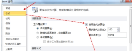 2.在“选项”对话框里面点击【公式】,把“启用迭代计算”勾上并点击【确定】。