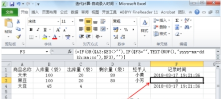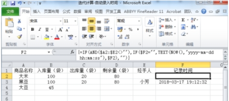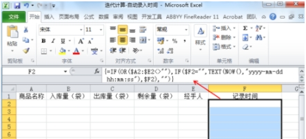 (2)如果A2~E2单元格只要一个单元格不是空白,那么它将会执行“IF($F2=\"\",TEXT(NOW(),\"yyyy-mm-dd hh:mm:ss\"),$F2)”的迭代计算,F2单元格将将会自动记录当前的时间,即使其它单元格数值改变,F2的时间也不会改变。