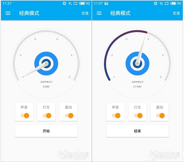 呼噜克星App主界面,可以检测呼噜分贝,然后发出声音震动灯光