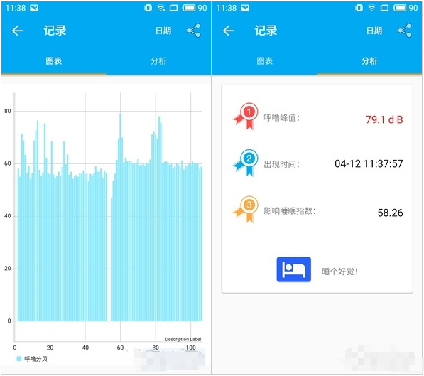 可以检测睡眠的噪声情况,呼噜声有多大一目了然