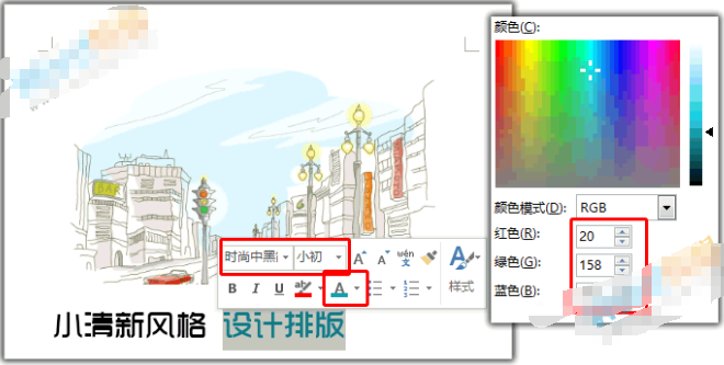 步骤一、将光标定位到图片下方,需要插入标题的位置,然后双击鼠标左键定位,输入我们的标题。字号【小初】;字体【时尚中黑简体】;一半为黑色,另一半则是青绿色RGB为【红色R:20;绿色G:158;蓝色B:171】。