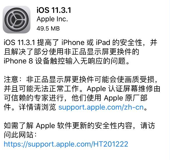 今日凌晨,苹果发布了iOS 11.3.1的更新,解决了此前很要命的iPhone 8换屏不工作的问题。