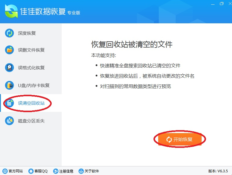 打开佳佳数据恢复软件,鼠标左键点击“误清空回收站”按钮,然后再点“开始恢复”按钮。