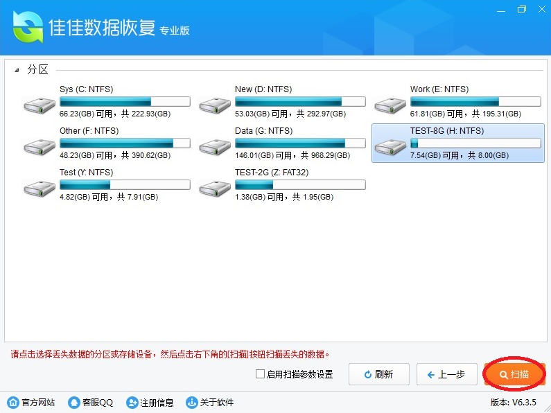 弹出对话框,提示“是否扫描TEST-8G(H:NTFS)”,点“是”,软件扫描H分区数据。