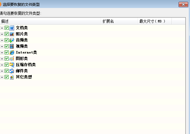 4、点击选择文件类型之后,会出现一个列表,小伙伴可以根据自己需求选择需要恢复的文件(这里点击的是全选),然后点确定,