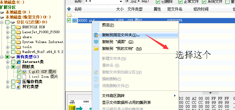6、勾选自己要恢复的文件或文件夹,点击右键选择——复制到指定文件夹(可以恢复到自己的空白U盘,切记不要到被恢复文件的磁盘下面),这里选择是桌面,点击完成之后就可以去验收文件了(PS: 恢复的文件会被编成数字形式,小伙伴需要挨个点击查看,这个比较麻烦)