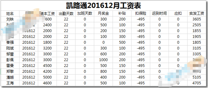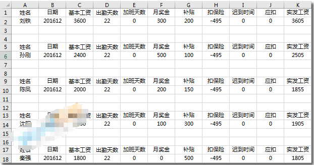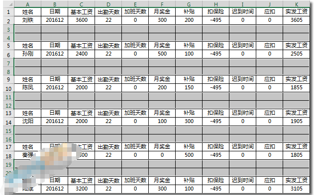 步骤一、首先你得有一份工资表或者是考勤表,然后排好数据,如下图所示。(注:不要把“工资表”和“工资条”混为一谈)