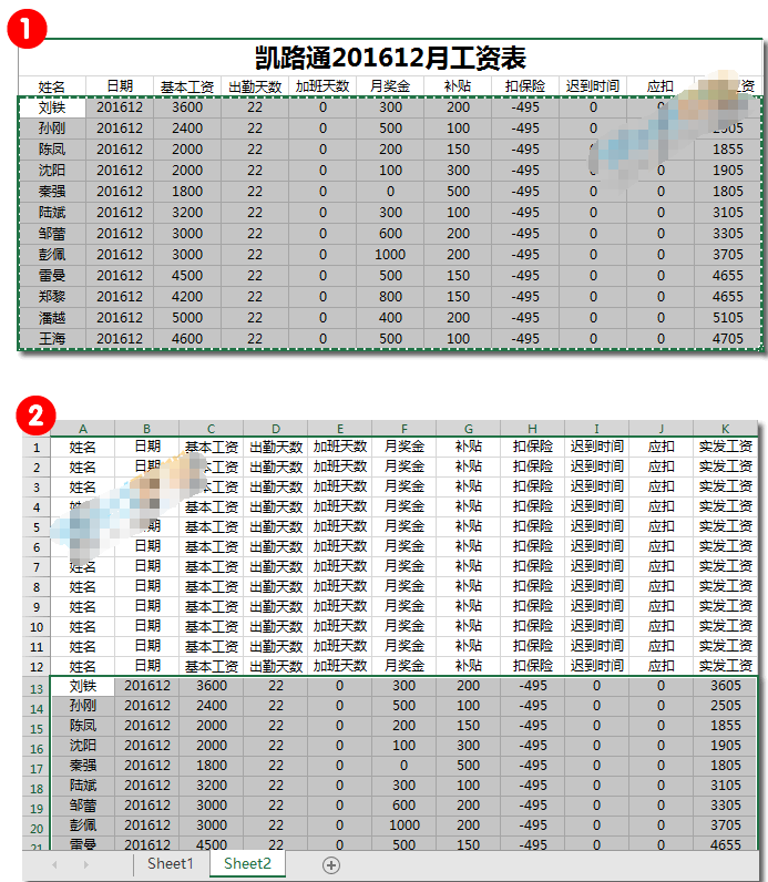 步骤一、将工资表表头部分复制到另一张excel空白表格中,或者复制到Sheet2中。