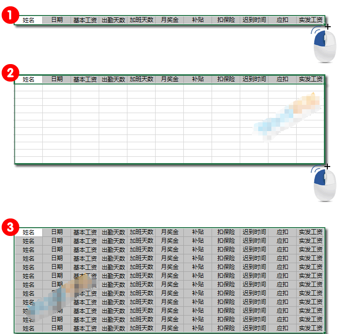 步骤四、重复上面方法,再在下面的空白行中加上辅助数据1、2、3……12序列填充。也许你还不理解我为什么要拉出这么多的空白行序列出来,其实这个是我们做工资表留白的地方,等下你就知道拉!