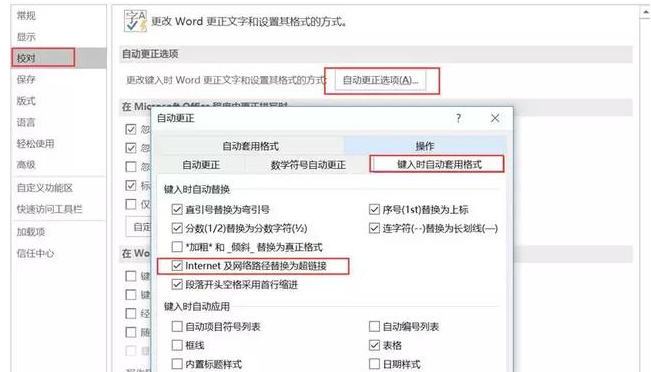 这时可以通过文件—选项—校对—自动更正选项—键入时自动套用格式—取消勾选 Internet及网络路径替换为超链接。