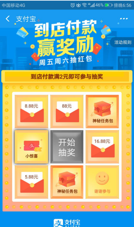 如果你单笔付款满两元,那么恭喜你可以参与抽奖啦!奖励最高现金88元,还有神秘惊喜大奖!
