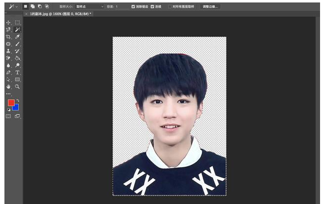 魔棒工具,适用于处理边界比较分明、背景是纯色的图像抠图,例如证件照一类。首先在左侧工具栏找到魔棒工具,或是直接点键盘快捷键“W”。