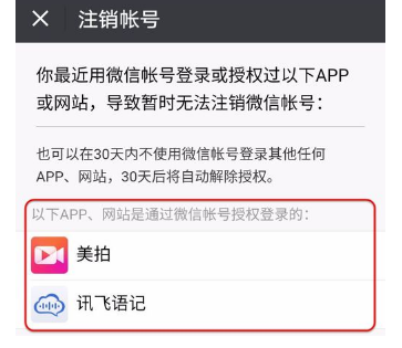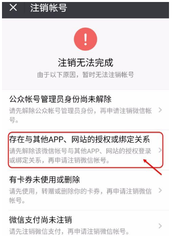 弹出“注销无法完成”窗口,点击【存在与其他APP,网站授权或绑定关系】按钮;