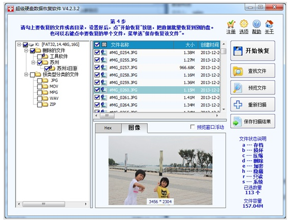 扫描后,列出来很多丢失的文件,我们很容易看到这次被删除的目录“苏州1日游”,里面有不少照片,我们一个个图片点击,预览很完整,图片恢复没问题。(软件中的文件夹和图片文件的图标上有个英文字母d字,表示这些文件是被直接删除的,做了删除标志)。