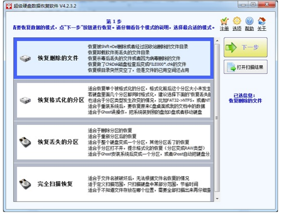 打开超级硬盘数据恢复软件,看到软件上有“恢复删除的文件”这个功能,我们点击它,然后点“下一步”按钮。