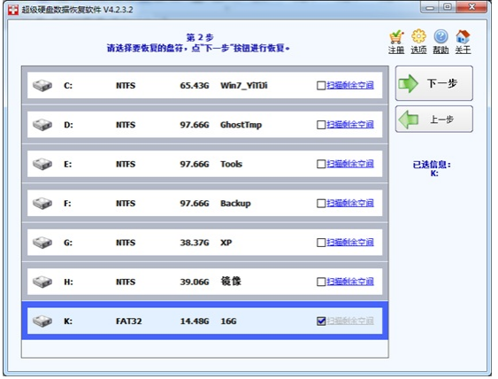 接下来是选择要扫描的盘符,这里的U盘盘符是K:, 我们点击它,再点“下一步”按钮。