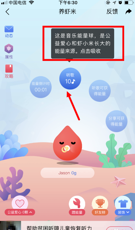 现在可以开始喂养虾米Baby了,首先点击下图红色箭头所指的可收获的能量球(听音乐是可以获得能量球的)。