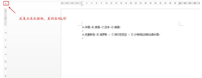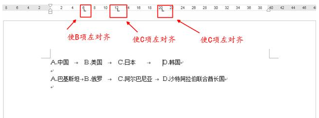 第四步:在横向标尺上点选,使A、B、C、D选项左对齐