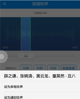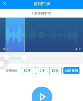 进入“剪辑铃声”界面,这里可能选择“智能截曲”,也可以拖动滑块,调整裁剪音频的起始位置和长度;