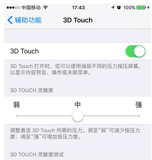 打开【设置】-【通用】-【辅助功能】-【3D Touch】,打开3D Touch功能,还可以调节灵敏度,如下图所示: