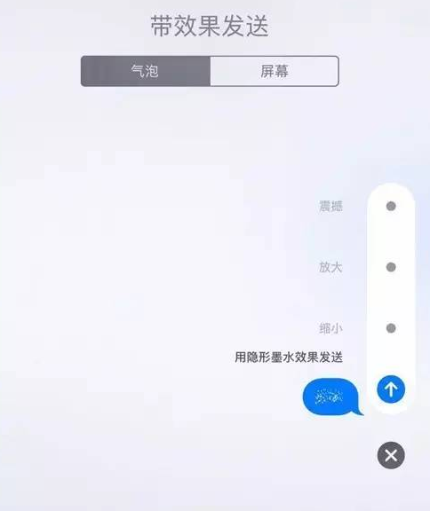 然后我们回到短信界面,找到要发送的联系人,进行短信编辑,编辑完之后长按发送键,就会弹出效果工具栏。屏幕顶部可以切换【气泡】和【屏幕】,在【气泡】类别下找到【隐形墨水】。