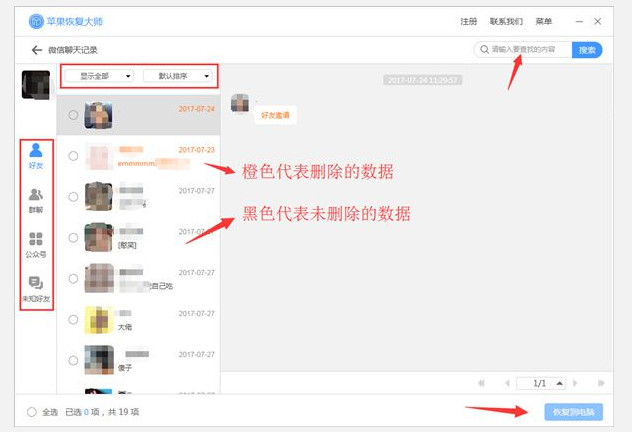 点击图标后,就等待软件扫描完成。扫描完毕,我们就可以查看到扫描结果。以恢复微信文字聊天记录为例:橙色字体是已经删除的微信聊天记录,黑色字体是未删除的微信聊天记录,勾选需要恢复或者导出的微信聊天记录,点击【恢复到电脑】即可。