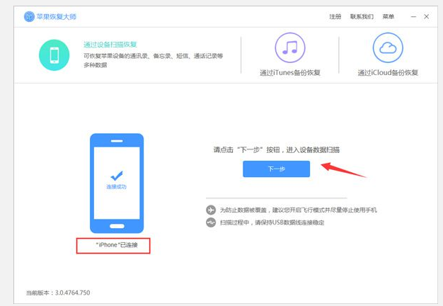 在电脑中打开苹果恢复大师,然后将iPhone手机连接到电脑,待软件自动识别到设备以后,我们就可以点击【下一步】(本文以无需备份的【通过设备扫描恢复】模式为例)