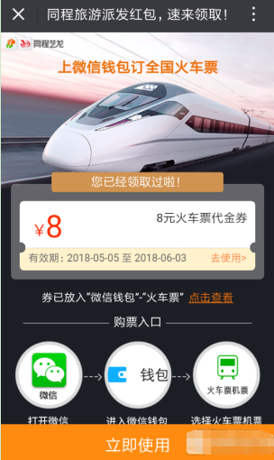 其实大家可以直接通过微信访问下方的地址链接,就能够进入同程旅游活动页面,从而领取8元无门槛火车优惠券了:点击此处,优惠券会直接发送到微信钱包中,可以通过“火车票机票”功能查看。