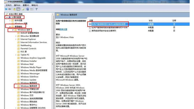 2、根据路径:计算机配置-管理模板-Windows组件-Windows登录选项 找到右侧菜单中的\"在用户登录期间显示有关以前登录的信息\",双击打开。