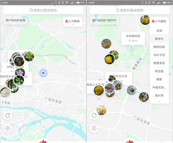 开启后,可以查看附近都有什么花朵植物,这些数据来自用户拍照分享