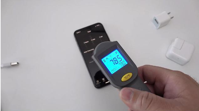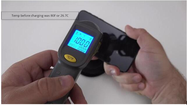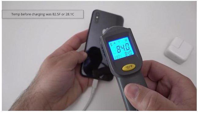 在未采用无线充电之前测量了iPhoneX的机身温度,为82.5℉。而在采用无线充电15分钟之后,iPhoneX的机身温度达到了100℉,换算成摄氏度为37.5℃。这个温度实际如果iPhoneX拿在手里的话,已经很明显感觉到机身的热度了。