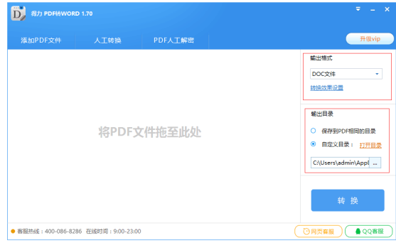 打开得力PDF转Word软件,设置转换输出格式(默认原生doc)、转换效果设置默认(不需要更改)、设置输出目录,